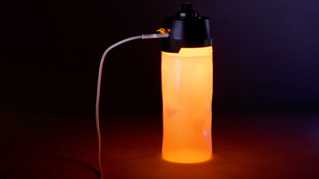 1/3 serious accidents are caused by a side impact from a vehicle. The Orb keeps you safe and seen from the side at night. The Orb functions as a water bottle, but the lid contains four super-bright LEDs that illuminate the bottle.